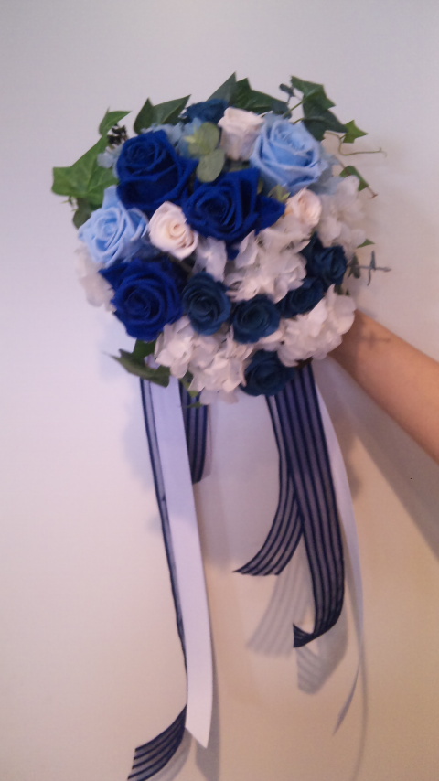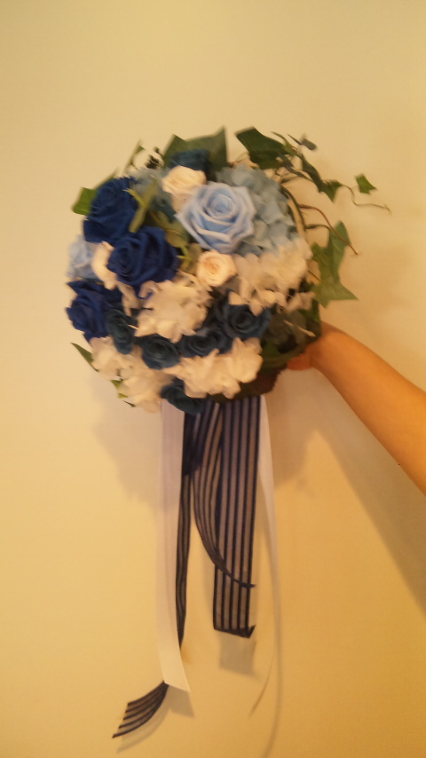 青系で仕上げたラウンドのプリザーブドフラワーの披露宴のブ ーケ