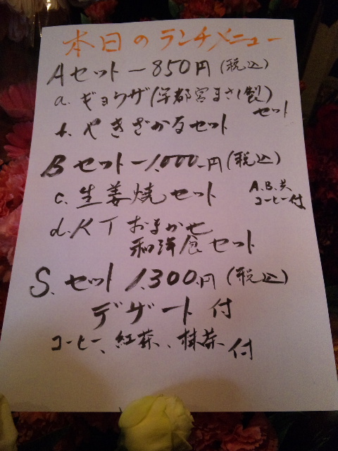 Aセット850円(税込み)a-餃子セットb-チキンのグリルセット〜Bセット1000円(税込み)c-ハンバーグセットd-しゃけのムニエルセットe-KTお任せ和洋食セット〜Sセット1300円(税込み)A又はBにデザート付き(コーヒー又は紅茶又は抹茶が選べます。)11月も最後の日になってしまいましたね。明日から師走です。風邪対策のお食事はいかがでしょうか。