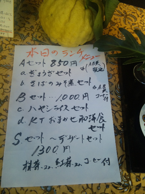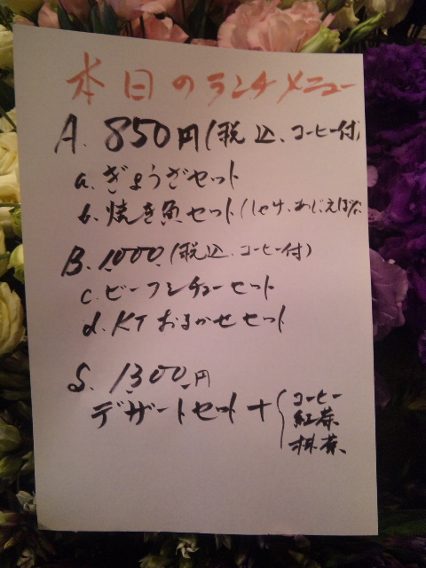 Aセット850円(税込み)a〜宇都宮まさしのギョウザセットb〜ぶりの照り焼き又は焼き魚セットBセッ1000円(税込み)c〜野菜たっぷりシチューセットd〜KTお任せ和洋食セットSセット-デザートセット1300円(税込み)(抹茶又は紅茶又はコーヒー付き)ランチは全てけんちん汁とコーヒー付きです。〜〜〜3時からフラワーデザイン教室がありますのでランチを召し上がってそのままKTで休日を過ごしませんか?お越しをお待ちいたしております。